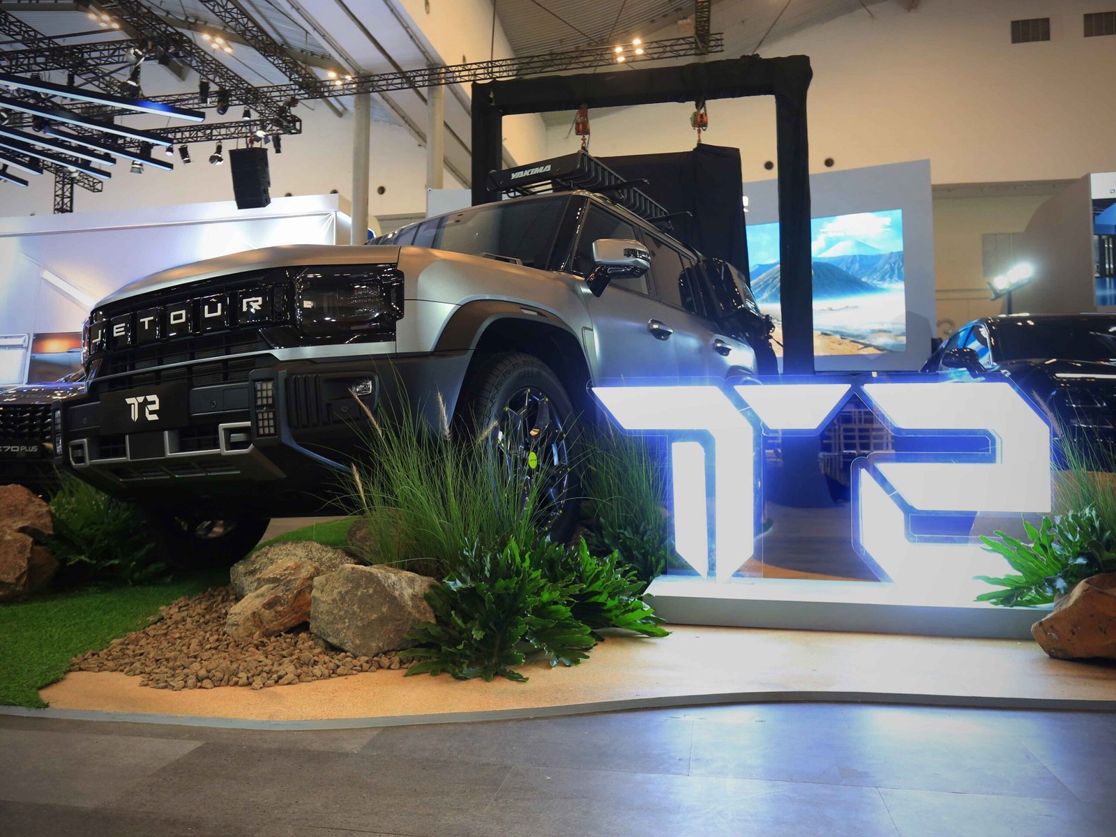 Tampilan desain eksteriornya unik dan fungsional, mencolok dengan siluet boxy yang ikonik, dan memancarkan karakter berani dan tangguh khas off-road SUV sejati. Setiap detail eksteriornya dirancang dengan tingkat craftsmanship tinggi, mulai dari grille depan yang khas, desain velg unik, hingga garis tubuh yang tegas dan berkarakter kuat. Garis-garis tajam, posisi bodi yang kokoh, serta sistem pencahayaan futuristik membuat T2 tampil percaya diri baik di jalur bebatuan maupun di tengah gemerlap jalanan kota.